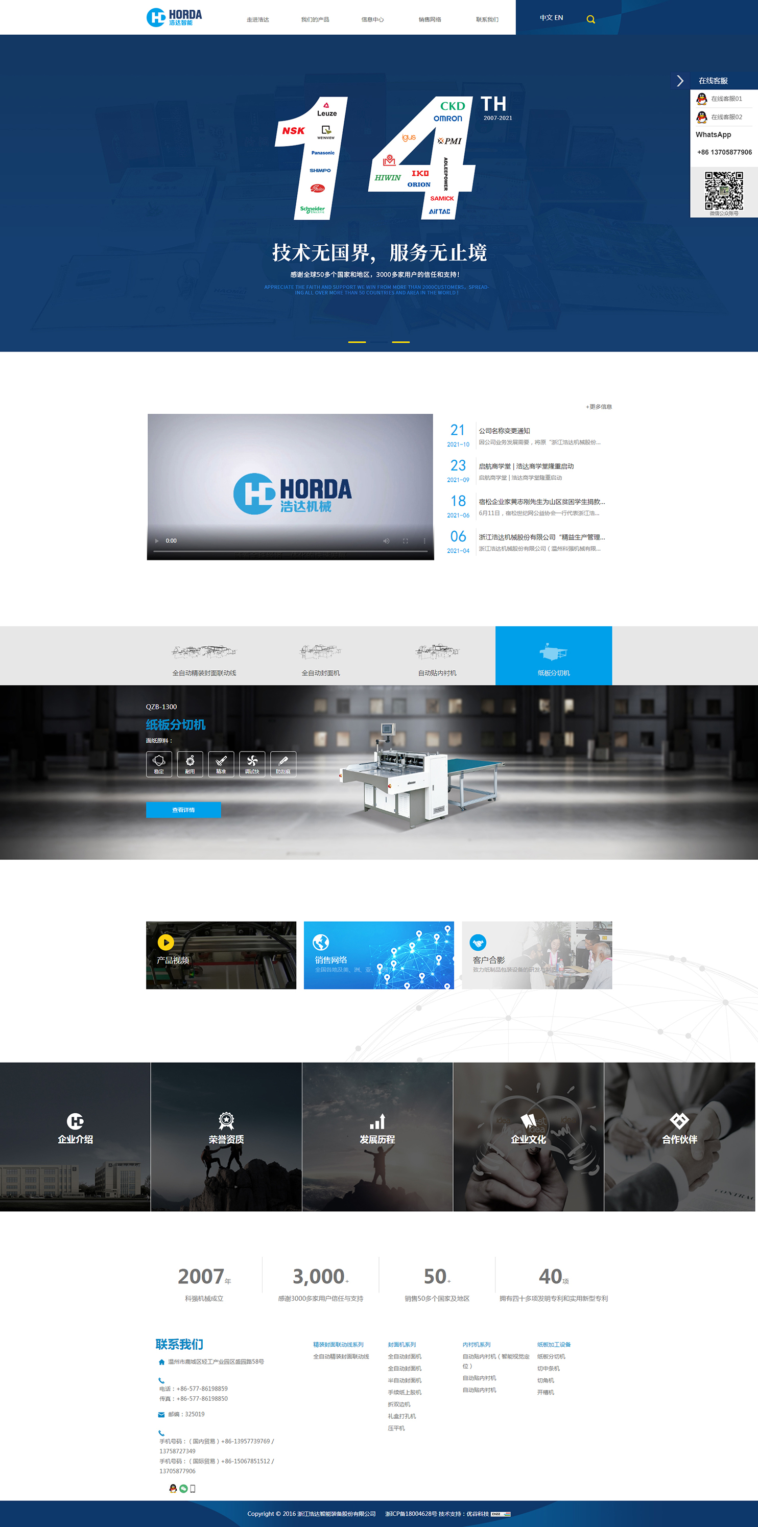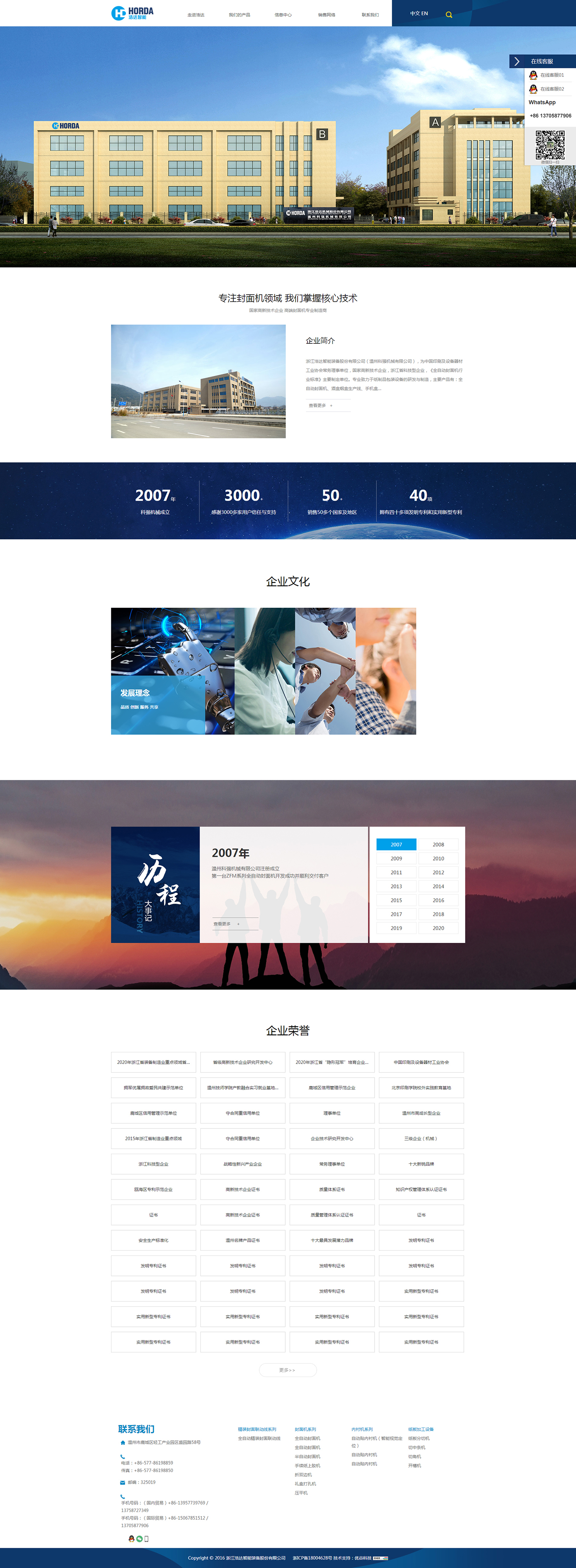 浙江浩達智能裝備股份有限公司(溫州科強機械有限公司),為中國印刷及設備器材工業協會常務理事單位,國家高新技術企業,浙江省科技型企業,《全自動封面機行業標準》主要制定單位。專業致力于紙制品包裝設備的研發與制造,主要產品有:全自動封面機、酒盒煙盒生產線、手機盒生產線、上膠機、紙板分切機等,產品通過了歐盟CE認證,并擁有多項國家專利,適用于印刷包裝企業大批量生產:白酒、香煙、月餅、茶葉、手機、內衣、工藝品、化妝品等外包裝盒及文件夾、臺歷、筆記本、精裝書封面等等,不但能全面提升產品質量和檔次,而且大大提高了生產效率。