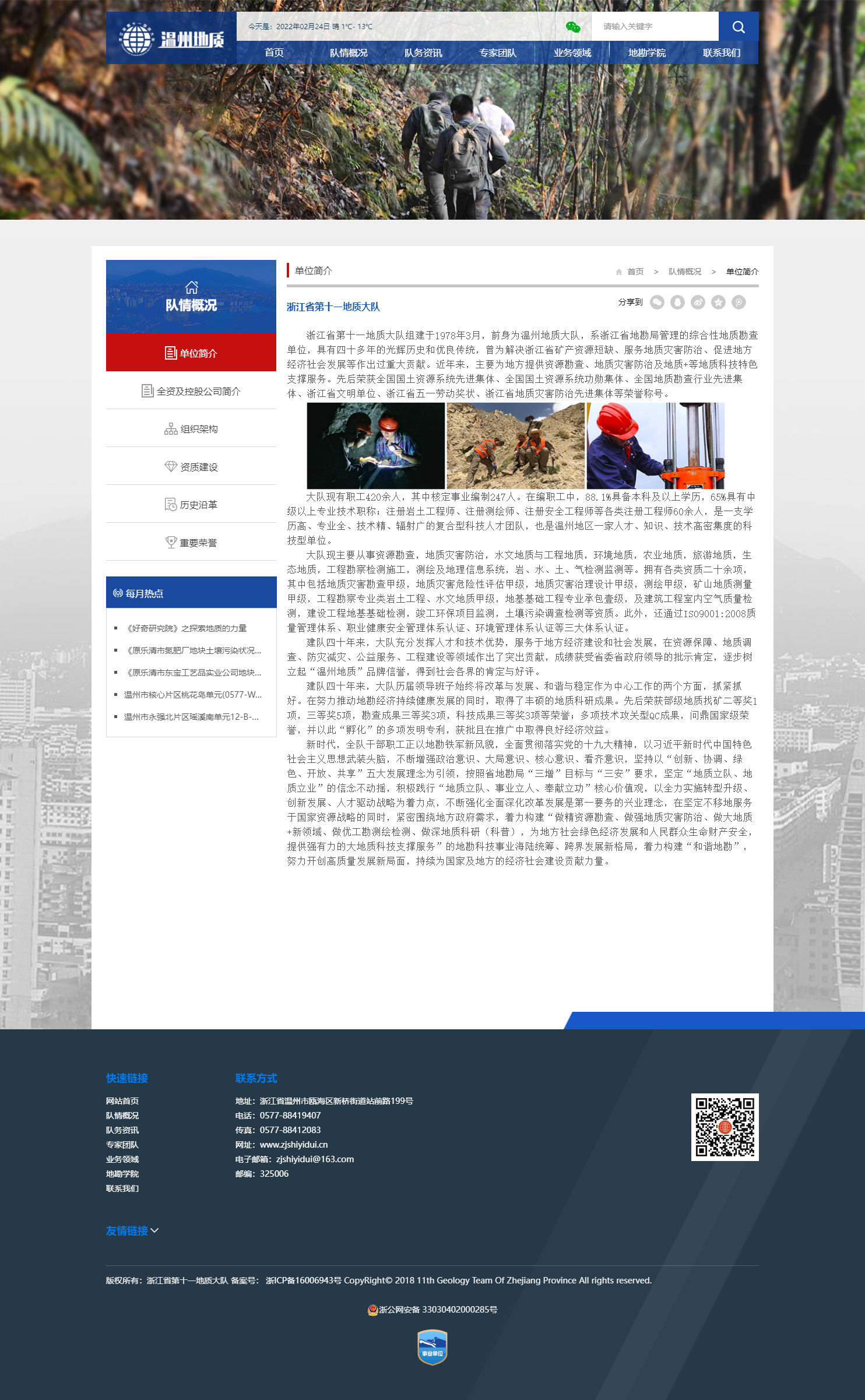 浙江省第十一地質大隊組建于1978年3月,前身為溫州地質大隊,系浙江省地勘局管理的綜合性地質勘查單位,具有四十多年的光輝歷史和優良傳統,曾為解決浙江省礦產資源短缺、服務地質災害防治、促進地方經濟社會發展等作出過重大貢獻。近年來,主要為地方提供資源勘查、地質災害防治及地質+等地質科技特色支撐服務。先后榮獲全國國土資源系統先進集體、全國國土資源系統功勛集體、全國地質勘查行業先進集體、浙江省文明單位、浙江省五一勞動獎狀、浙江省地質災害防治先進集體等榮譽稱號。