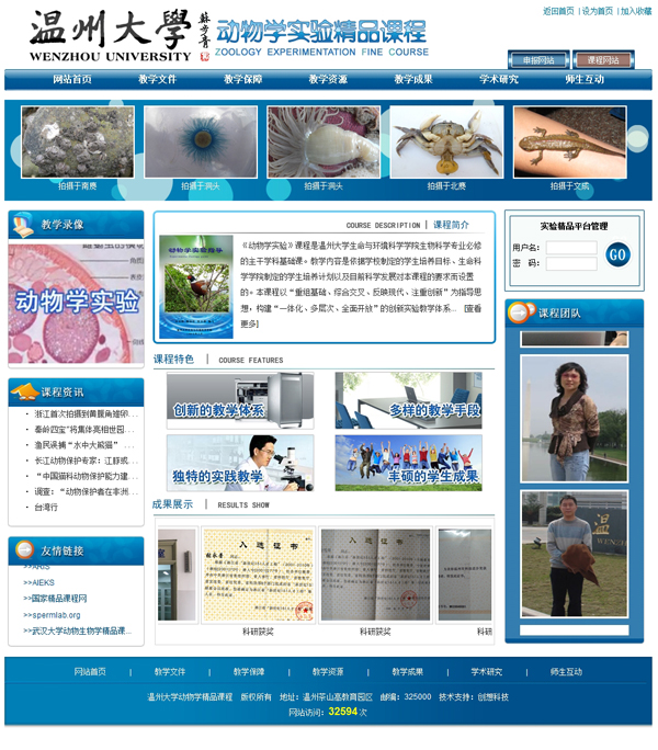 我公司為溫州大學生命與環境科學學院,建立的動物學實驗精品課程網 經浙江省教育廳評審,被評為浙江省高等學校省級精品課程網站。這也是我公司開創了第一個省級精品課程網。同時也慶祝公司在精品課程網站制作方面更上一個新的臺階,同時希望以后能夠為高等院校服務,創立更好的網站。